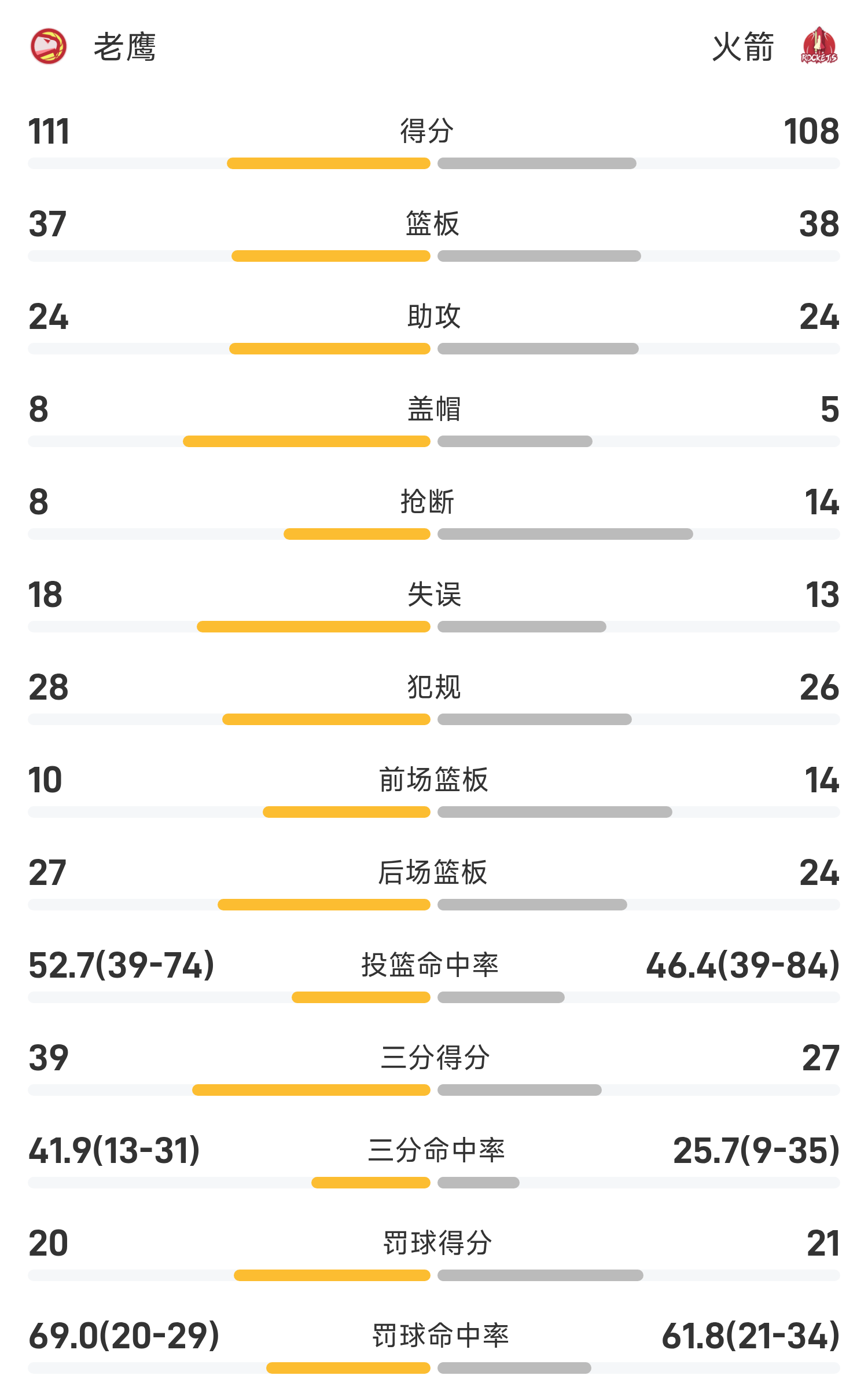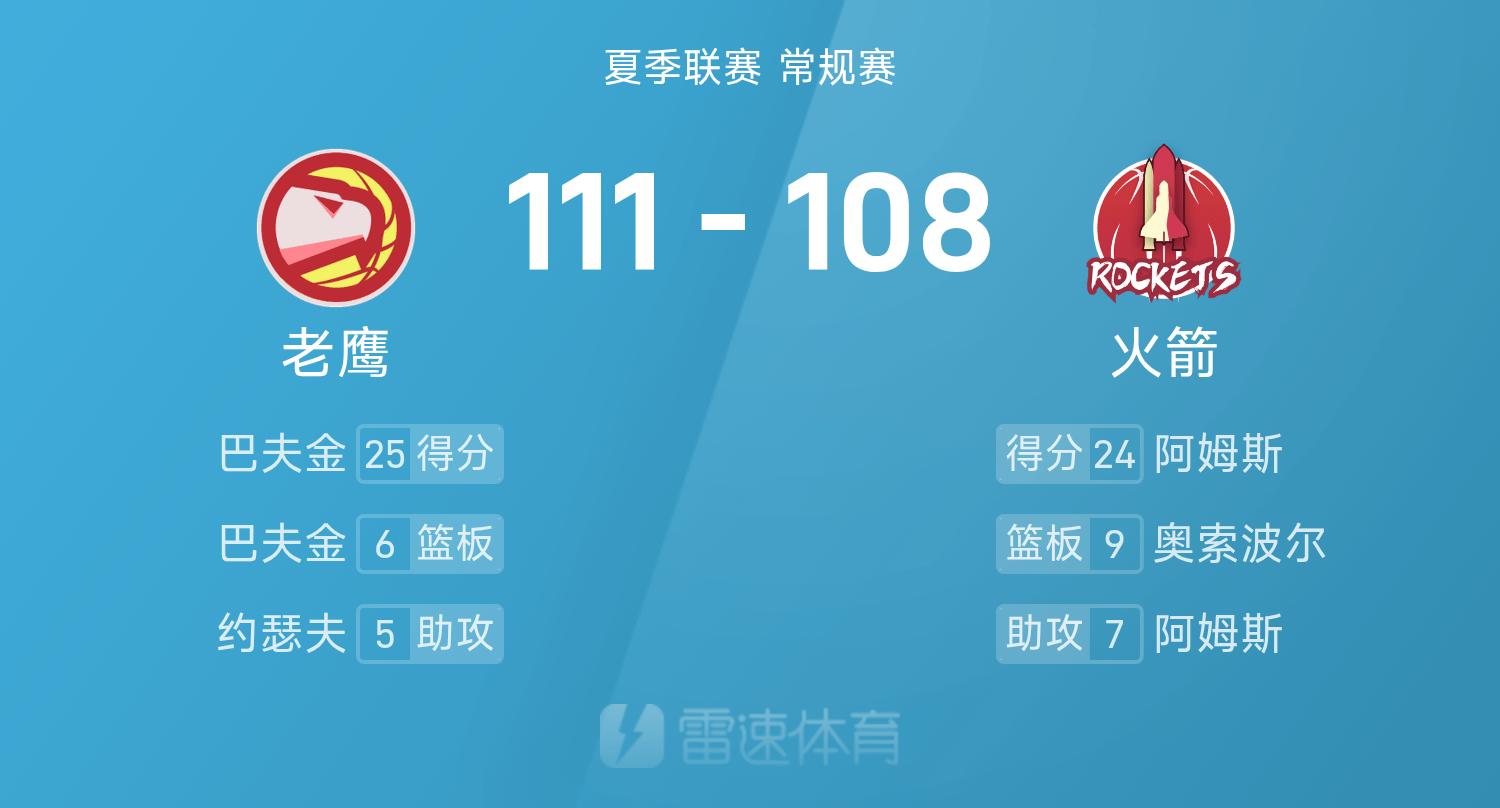 07月15日讯 夏季联赛火箭对阵老鹰。双方全场战罢,火箭108-111不敌老鹰。巴夫金砍下全场最高的25分6板3助,率领老鹰成功取胜。